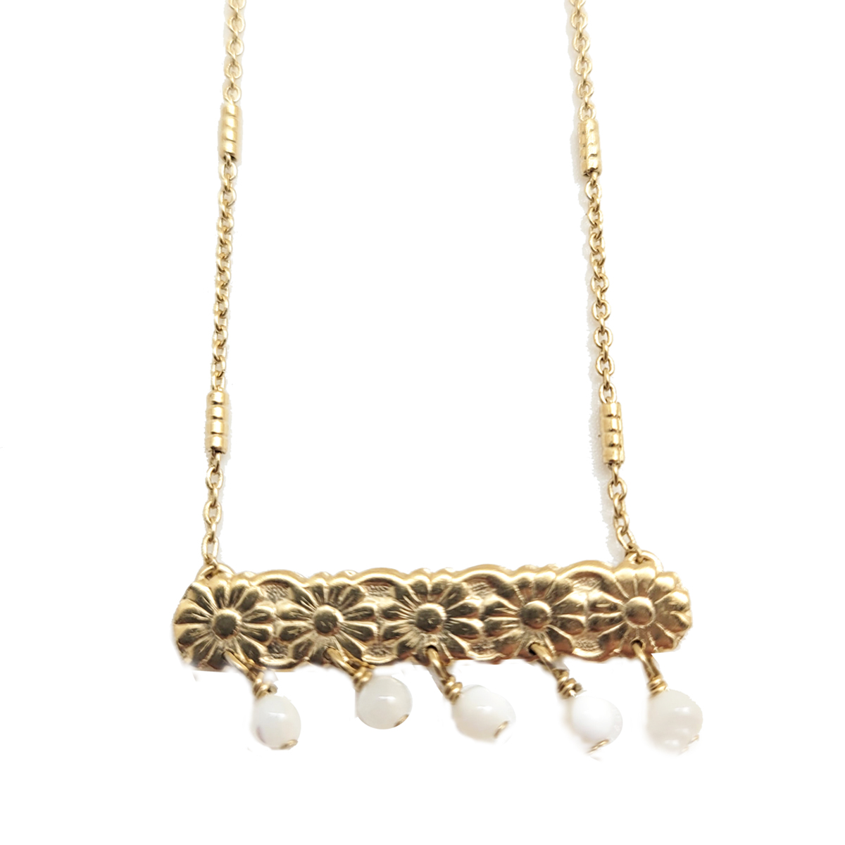 Le sautoir FRIDA est doré à l'or fin 24 carats, et ponctué de fleurs et de perles de nacre. Notre dorure est mate et de belle qualité.