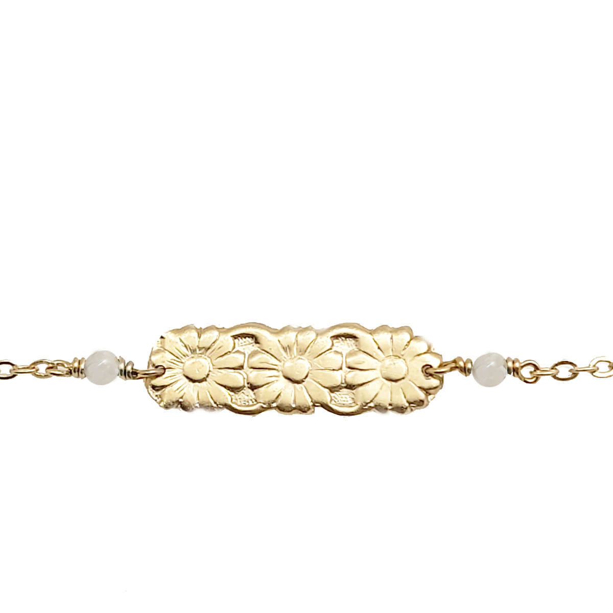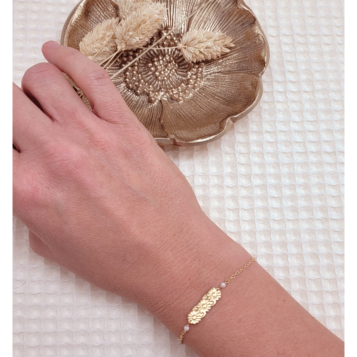 Le bracelet FRIDA est doré à l'or fin 24 carats, et ponctué de fleurs et de perles de nacre. Notre dorure est mate et de belle qualité.