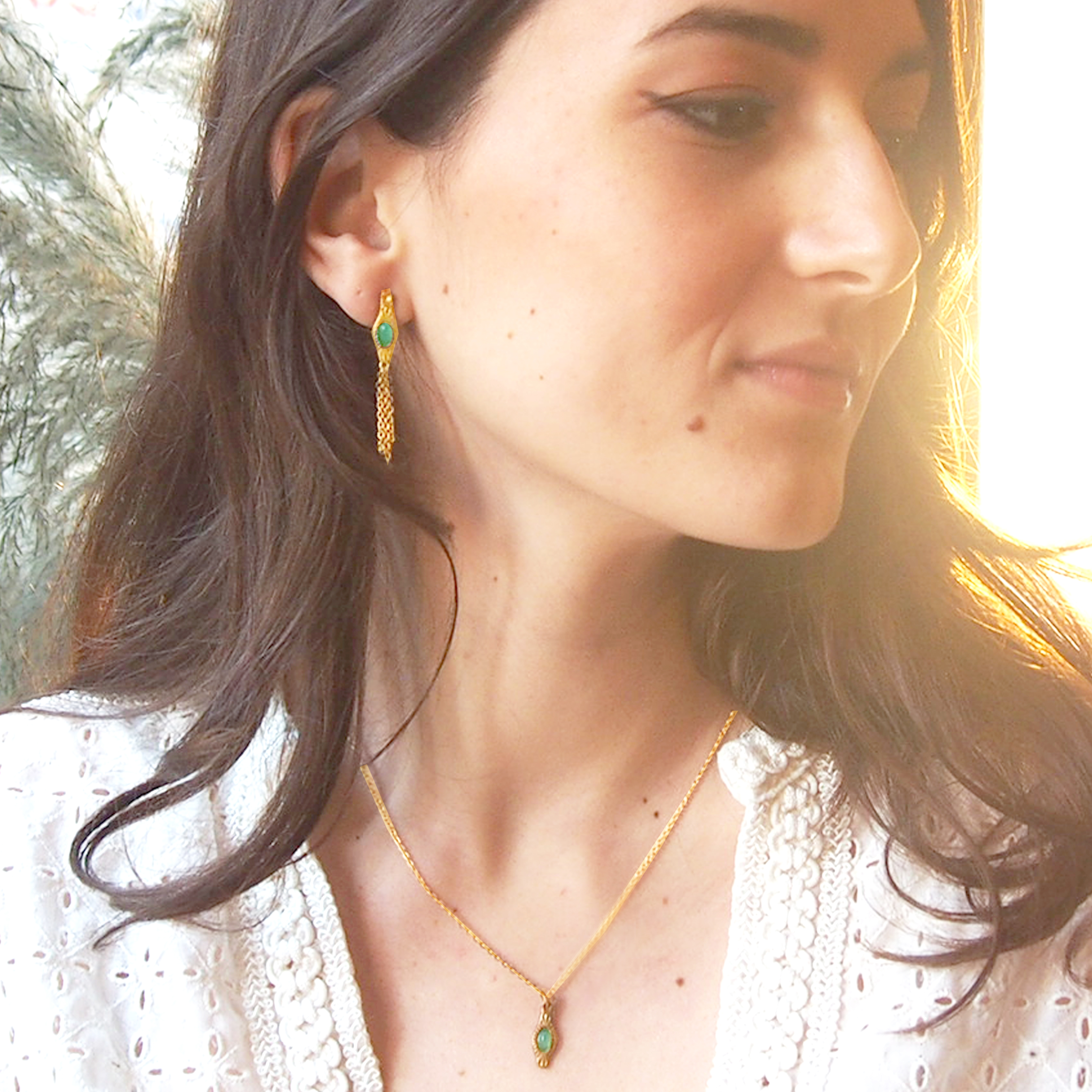 La collection Caribé est un ensemble de bijoux très fins, solaires, parsemés de pierres d'amazonite verte.