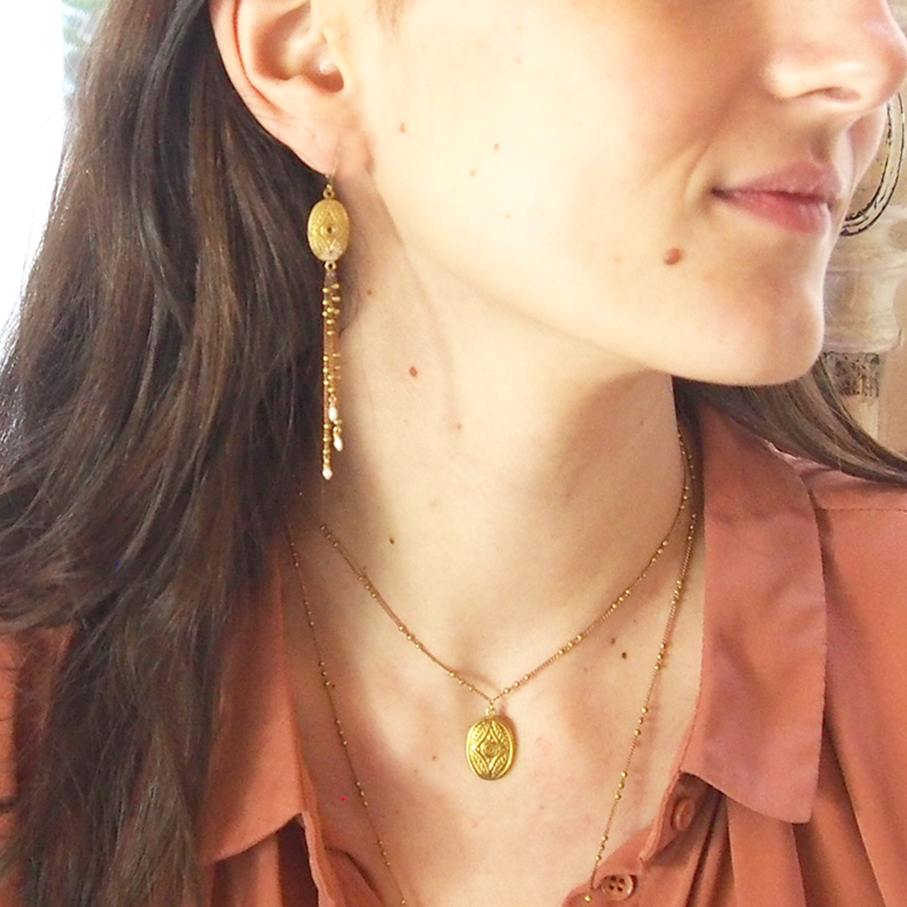 nos saisons chaudes. Sur ce médaillon à l'allure vintage, on retrouve des branches de palmier. La mer, quant à elle, est évoquée par les perles baroques.