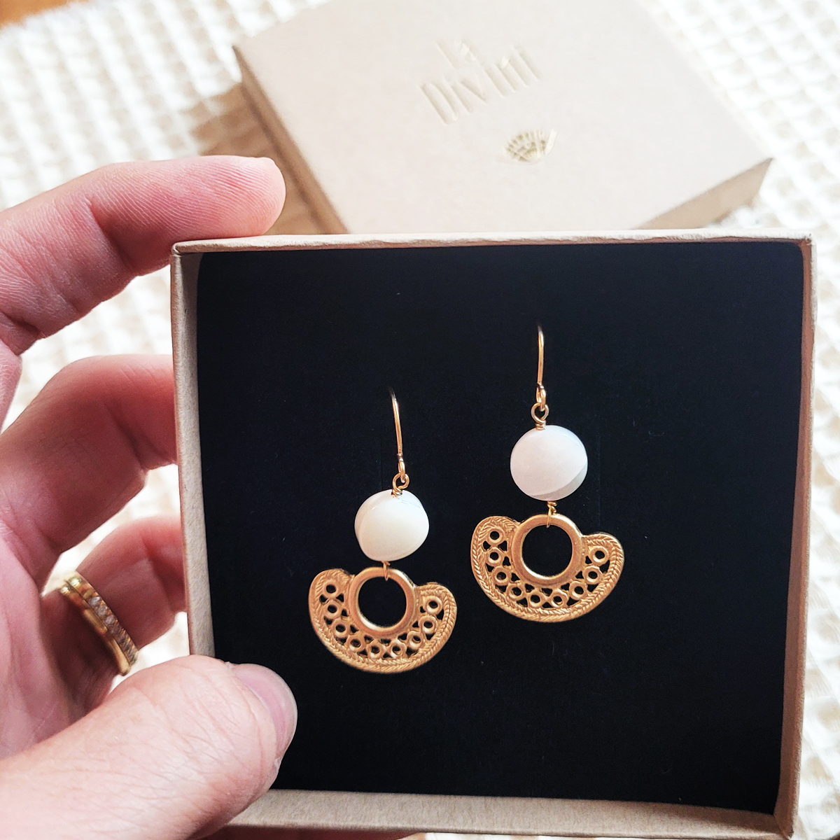 Très légères , les MAYA se composent d'une nacre lumineuse et d'estampes reprenant les symboles traditionnels de cette civilisation, si inspirante !