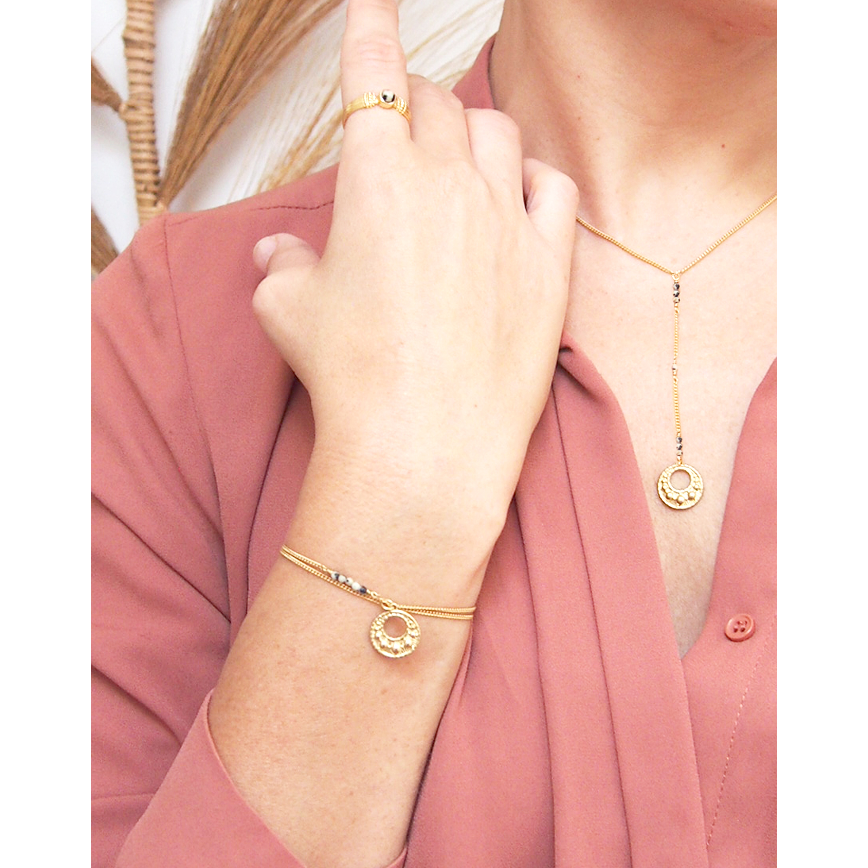 Avec GAÏA, nous évoquons la terre, avec des pierres de jaspe dalmatien mouchetées.