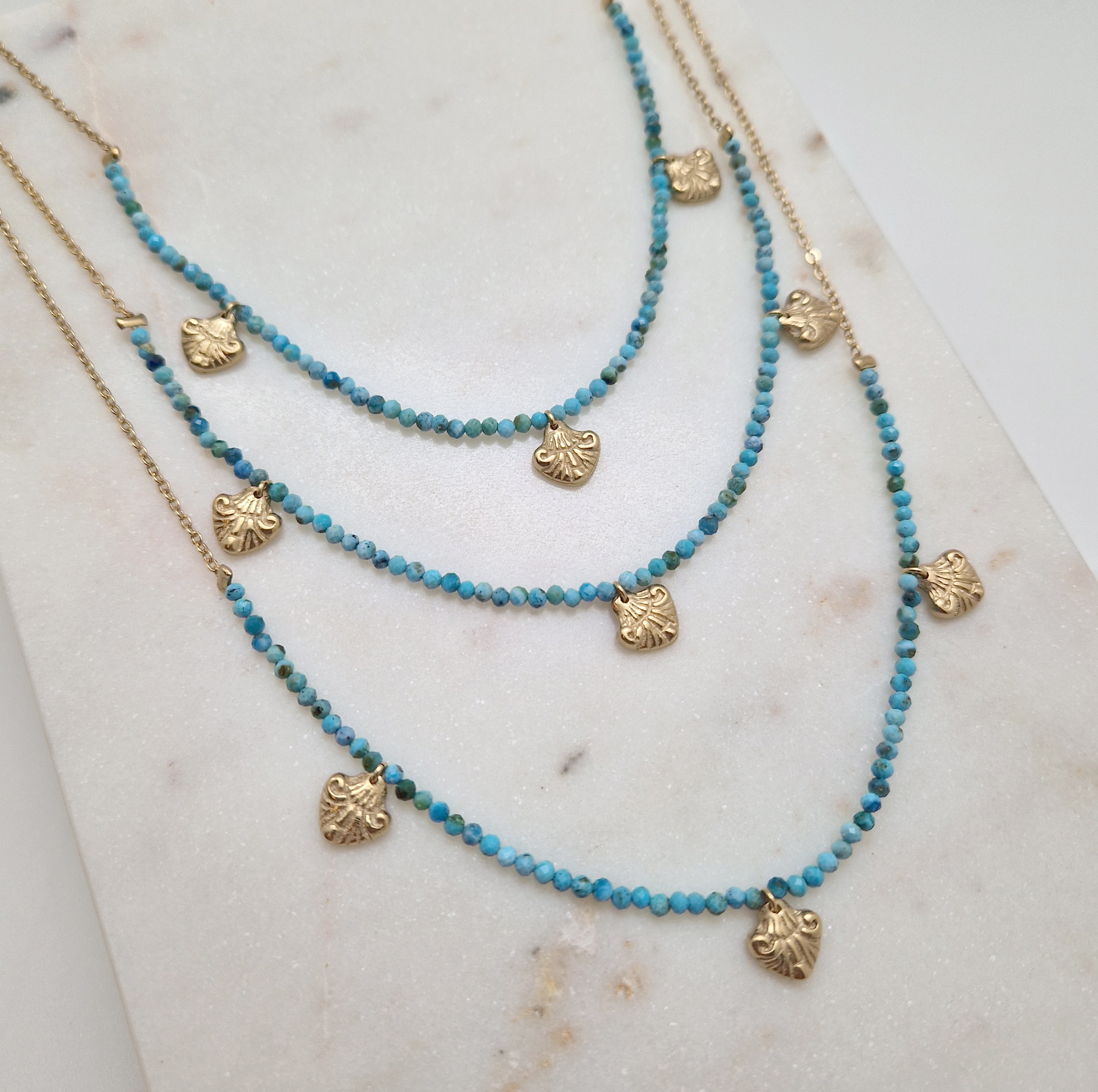 TIBET est un collier fin mélant des pierres de turquoise et des estampes, reprenant des motifs tibétains.