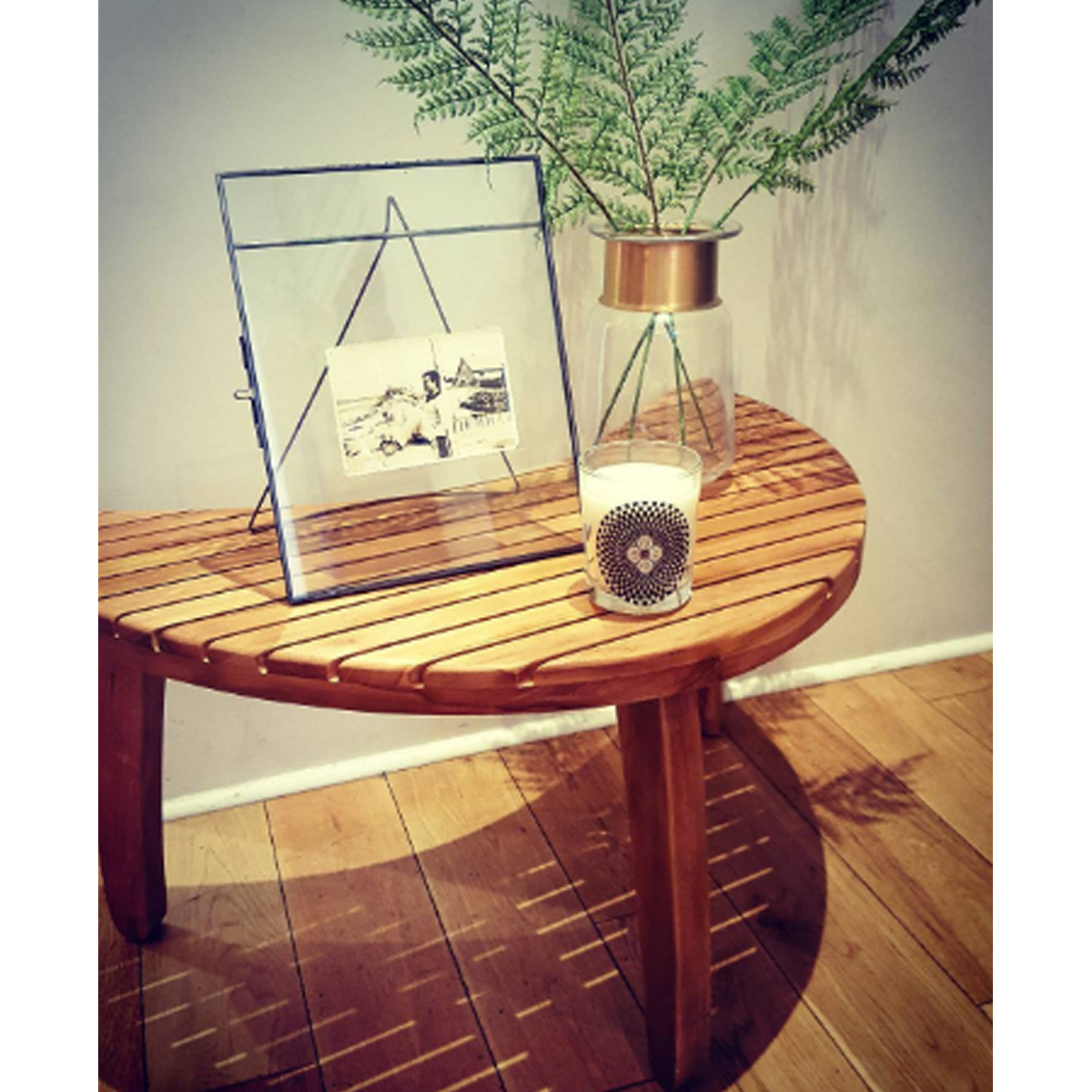Dessinée par Audrey. Cette table basse est en teck massif brut.Idéale en bout de canapé ou dans des angles.