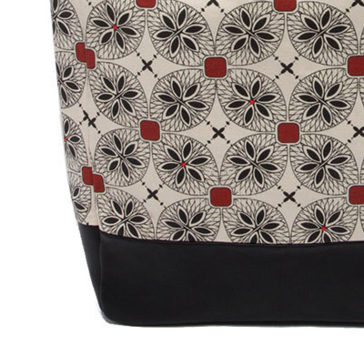 Un Cabas en tissu sérigraphié et en cuir noir.