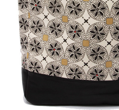 Un Cabas en tissu sérigraphié et en cuir noir.