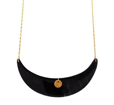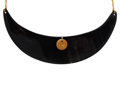 Le collier FIANARANTSOA est un collier de type plastron. Ici la corne,se marie aves des éléments dorés à l'or fin 24 carrats.