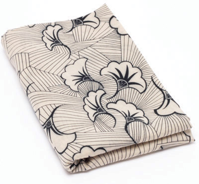 Grand foulard en coton beige, imprimé du motif WAX noir de La Divini, parsemé de feuilles de ginkgo biloba