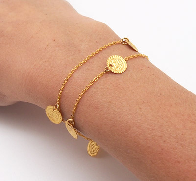 Un bracelet deux tours parsemé de petites médailles ajourées.