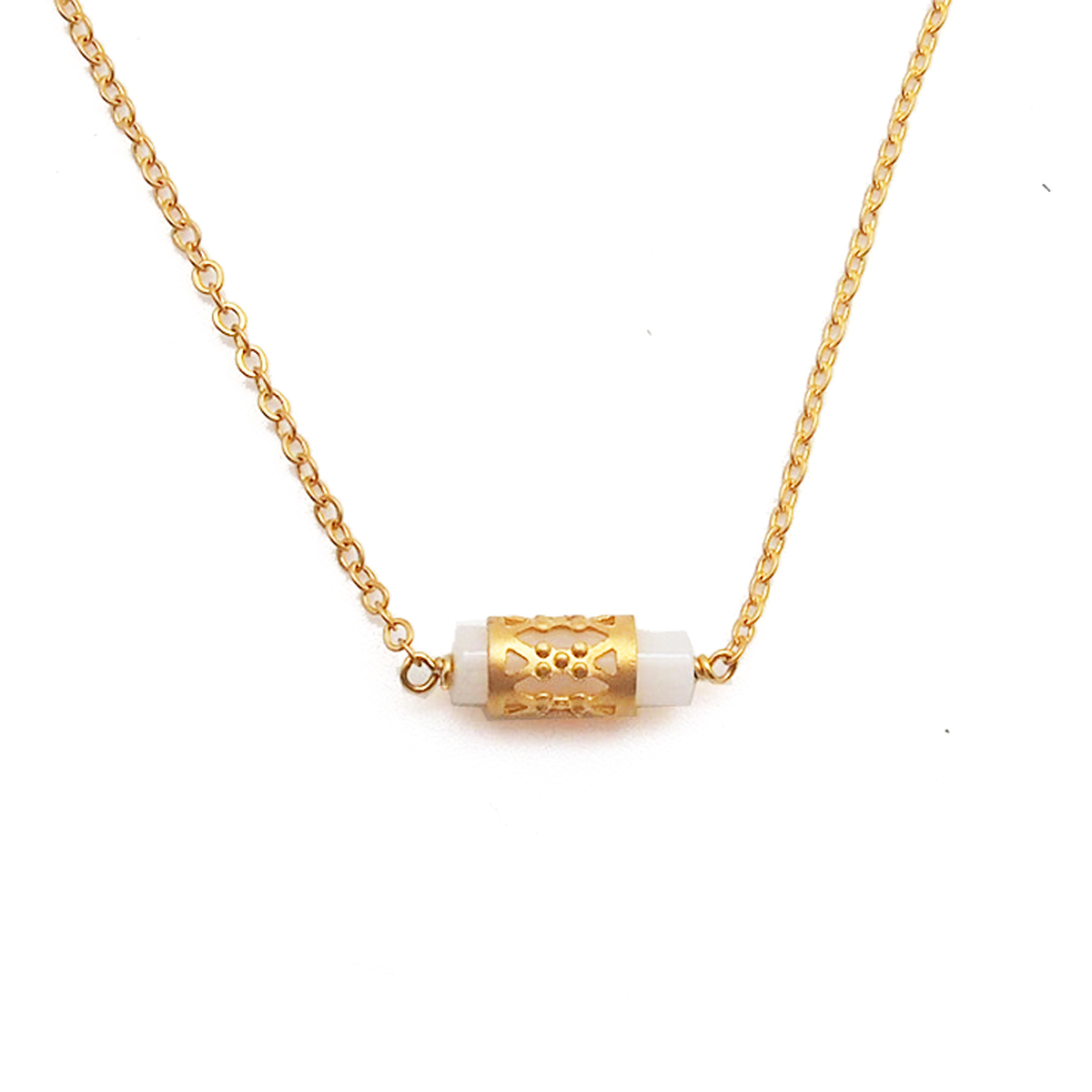 Le collier MéRIDA est d'un élément ajouré en laiton doré à l'or fin 24 carats et d'une pierre en nacre.