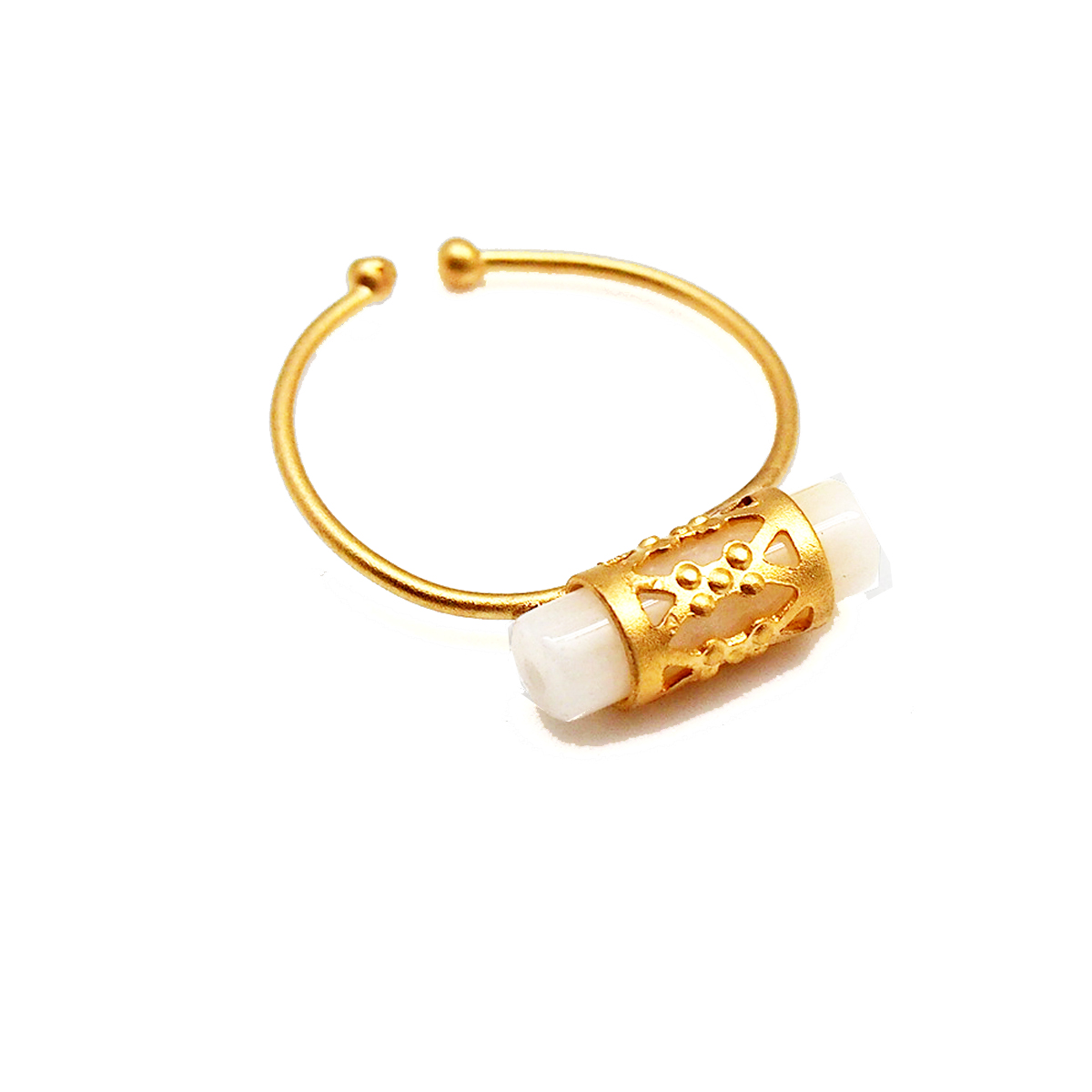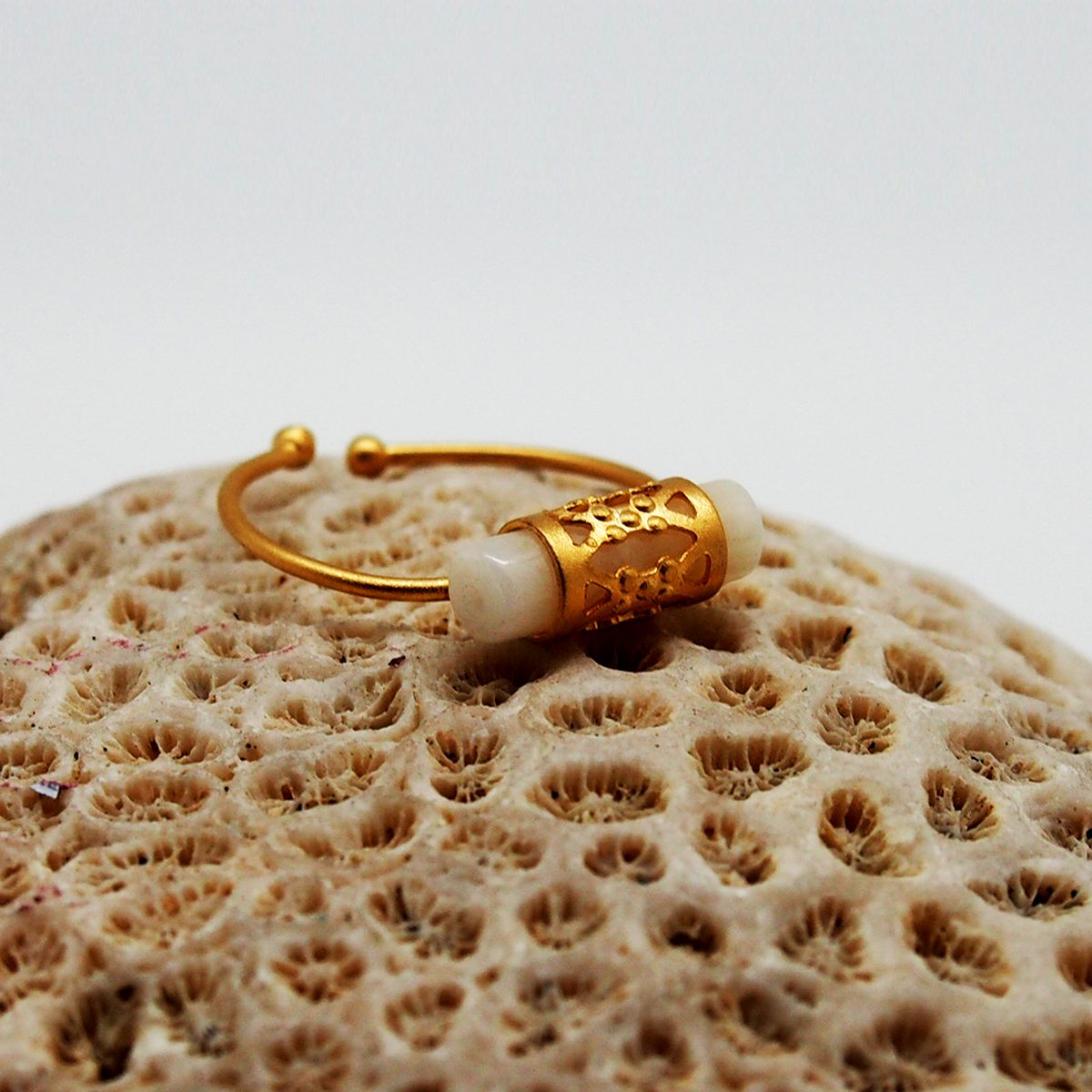 La bague MéRIDA est composée d'un élément ajouré en laiton doré à l'or fin 24 carats et d'une pierre en nacre