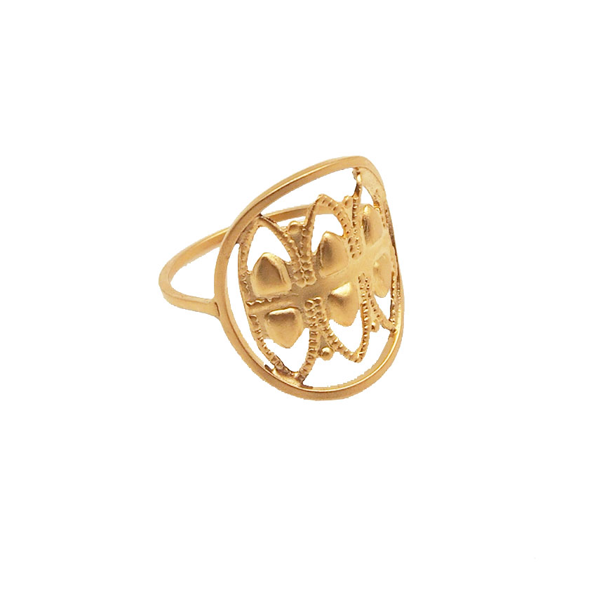 Cette bague est travaillée main dans notre atelier. Elle est ensuite dorée à l'or fin 24 carats. Notre dorure est mate et de belle qualité.
