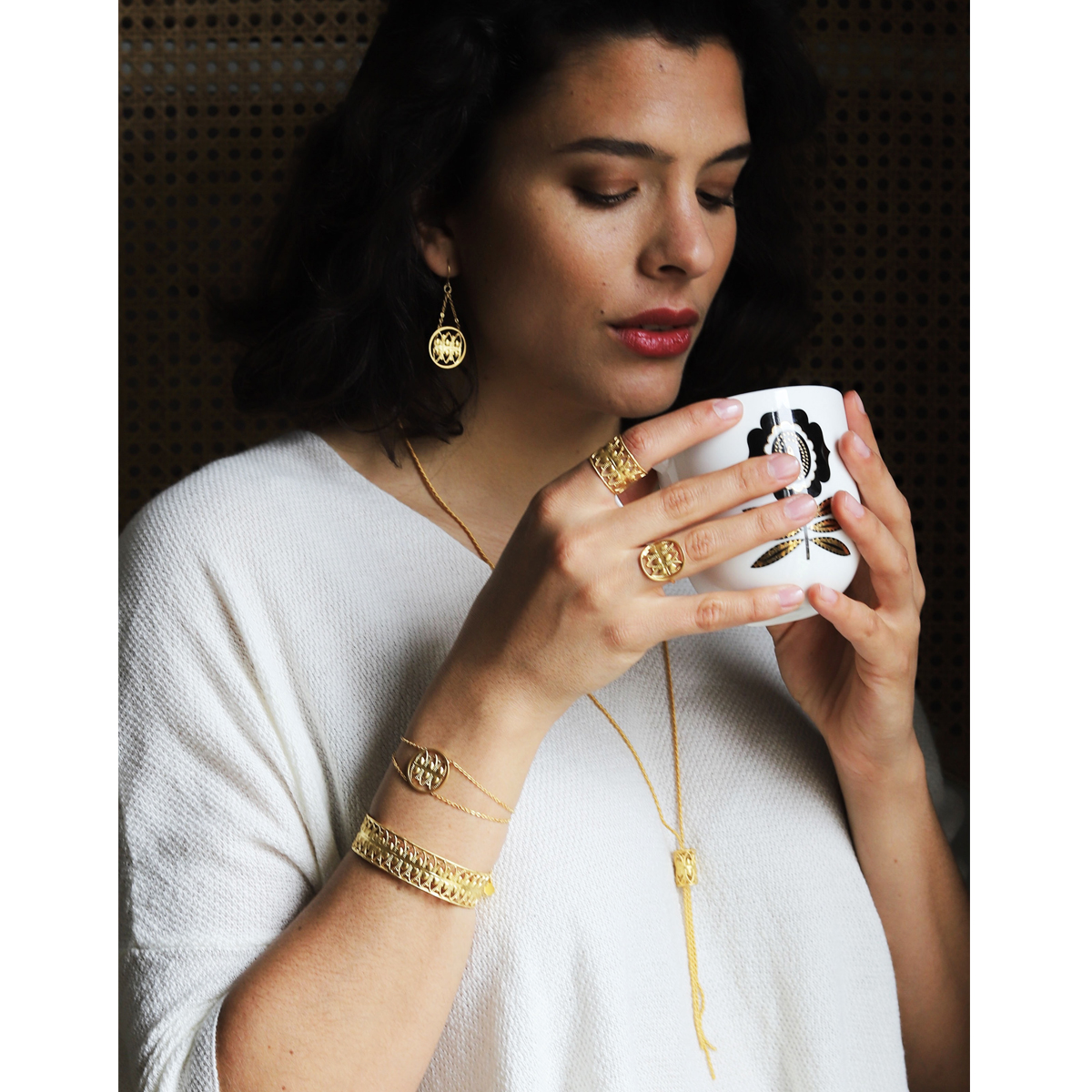 Cette bague est travaillée main dans notre atelier. Elle est ensuite dorée à l'or fin 24 carats. Notre dorure est mate et de belle qualité.