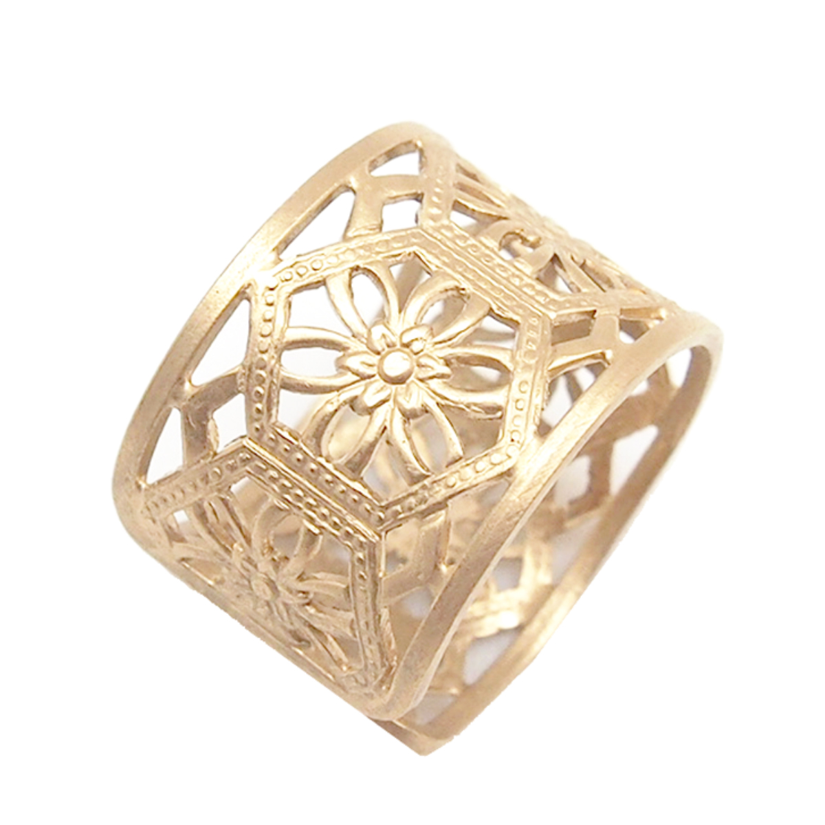 La bague est travaillée main dans notre atelier. Elle est ensuite dorée à l'or fin 24 carats. Notre dorure est mate et de belle qualité.