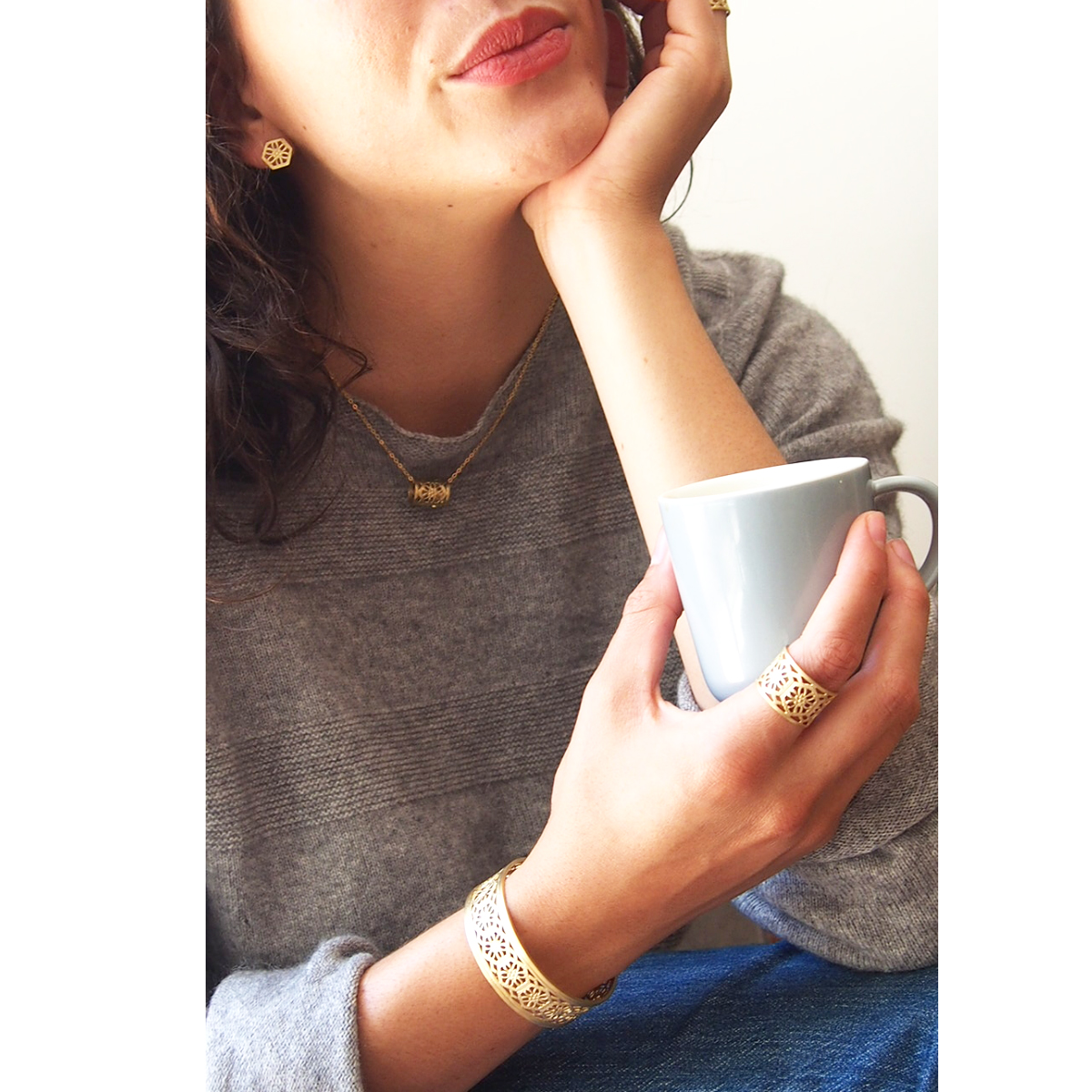 Ces boucles sont travaillées main dans notre atelier. Elle sont ensuite dorées à l'or fin 24 carats. Notre dorure est mate et de belle qualité.