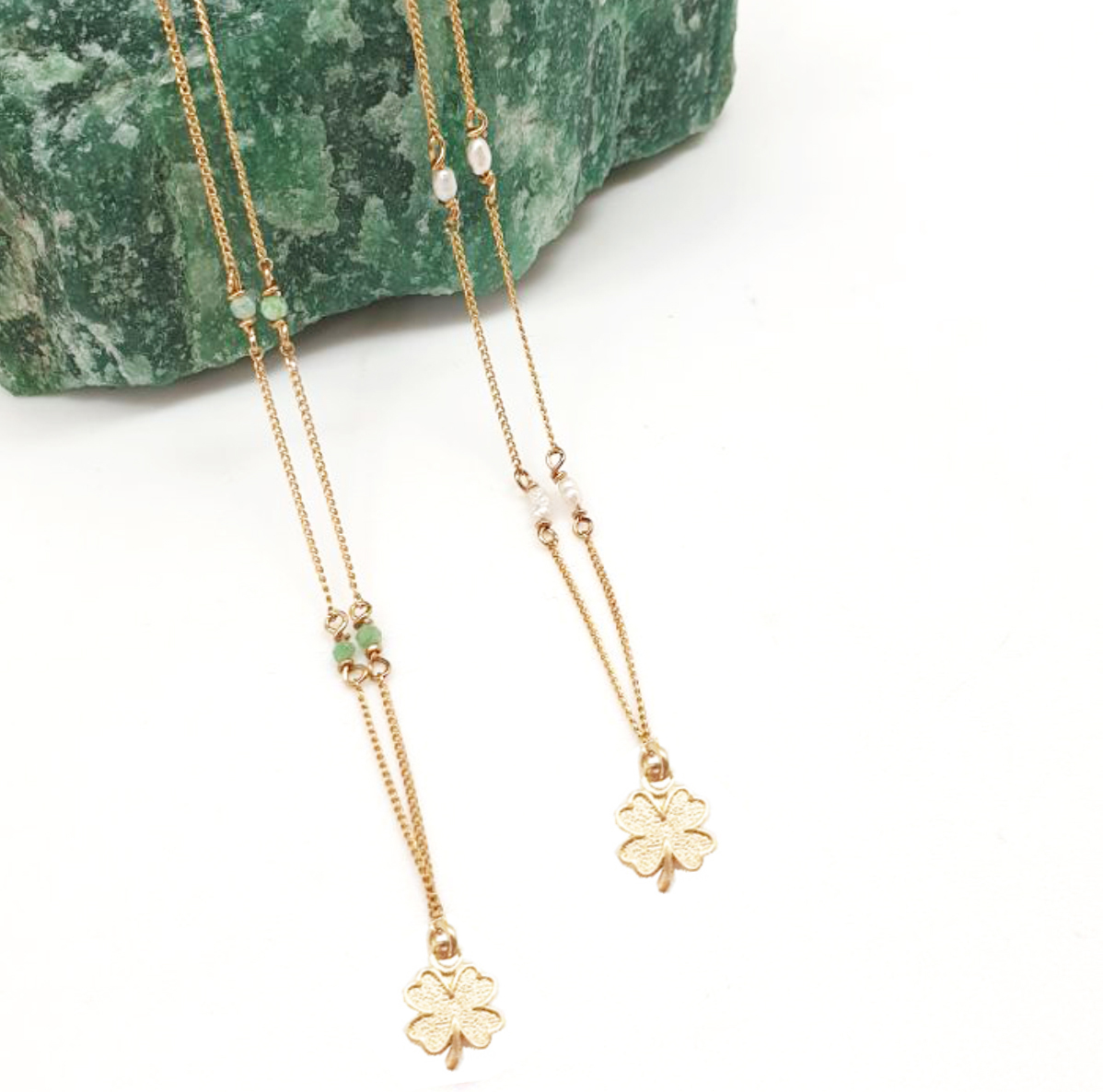 Ce collier est ponctué de perles de culture (2x3mm), et d'un trèfle, symbole de chance (8 x 6 mm). Il est travaillé main dans notre atelier, puis doré à l'or fin 24 carats. Notre dorure est mate et de belle qualité.