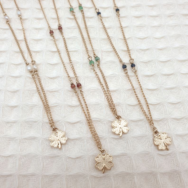 Ce collier est ponctué de rubi zoisite verts (2mm) et d'un trèfle, symbole de chance (8mm). Il est travaillé main dans notre atelier, puis doré à l'or fin 24 carats. Notre dorure est mate et de belle qualité.