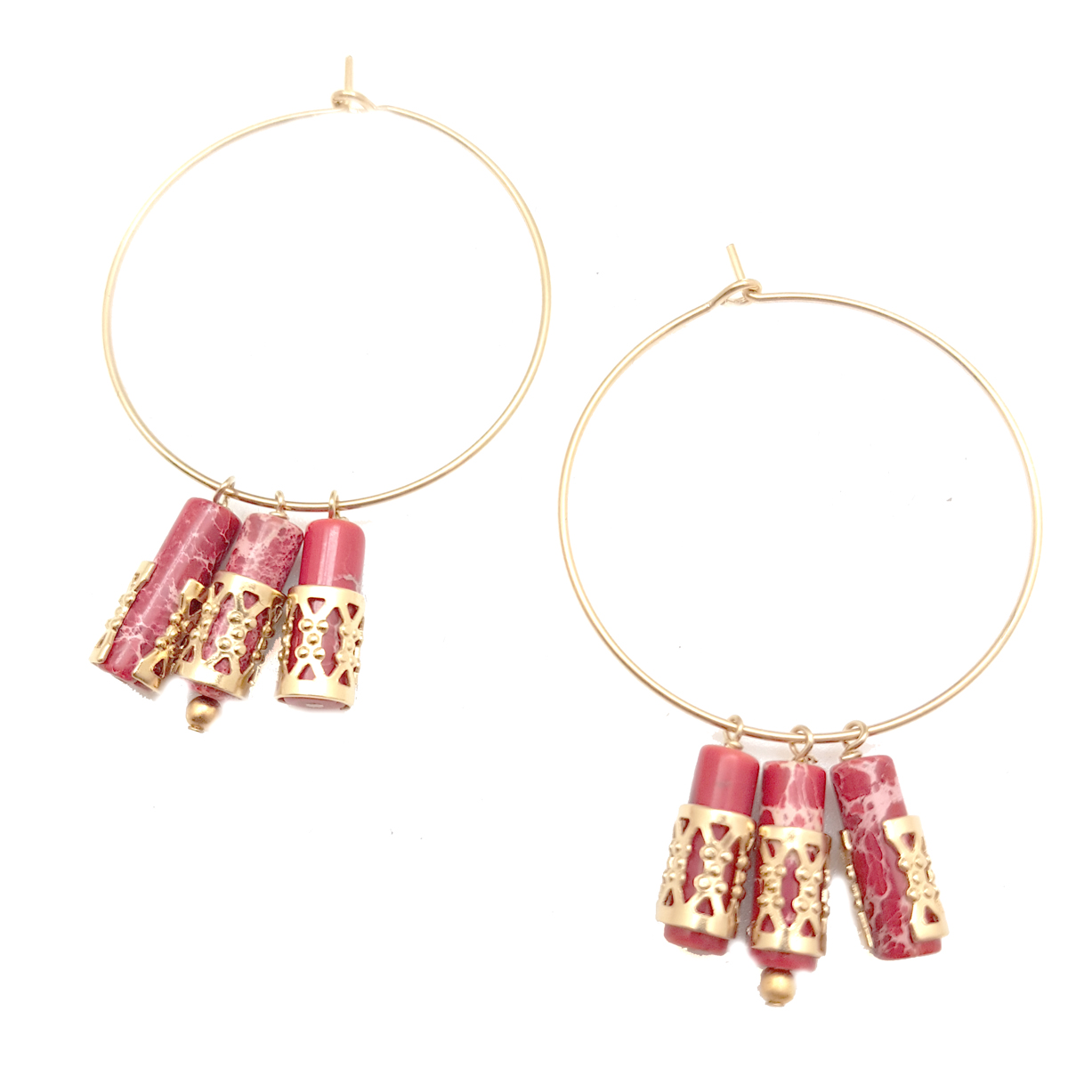 Les créoles BALI sont dorées à l'or fin 24 carats, ponctuées de pierres de jade impérial rouge. Notre dorure est mate et de belle qualité.