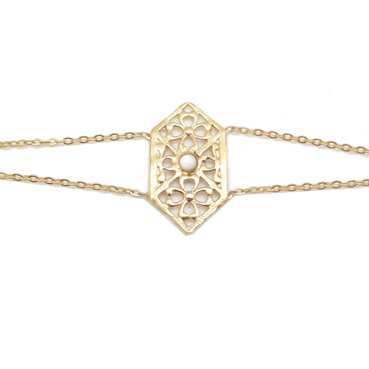 Le bracelet JASMIN est doré à l'or fin 24 carats, ponctué d'une pierre de nacre naturelle.