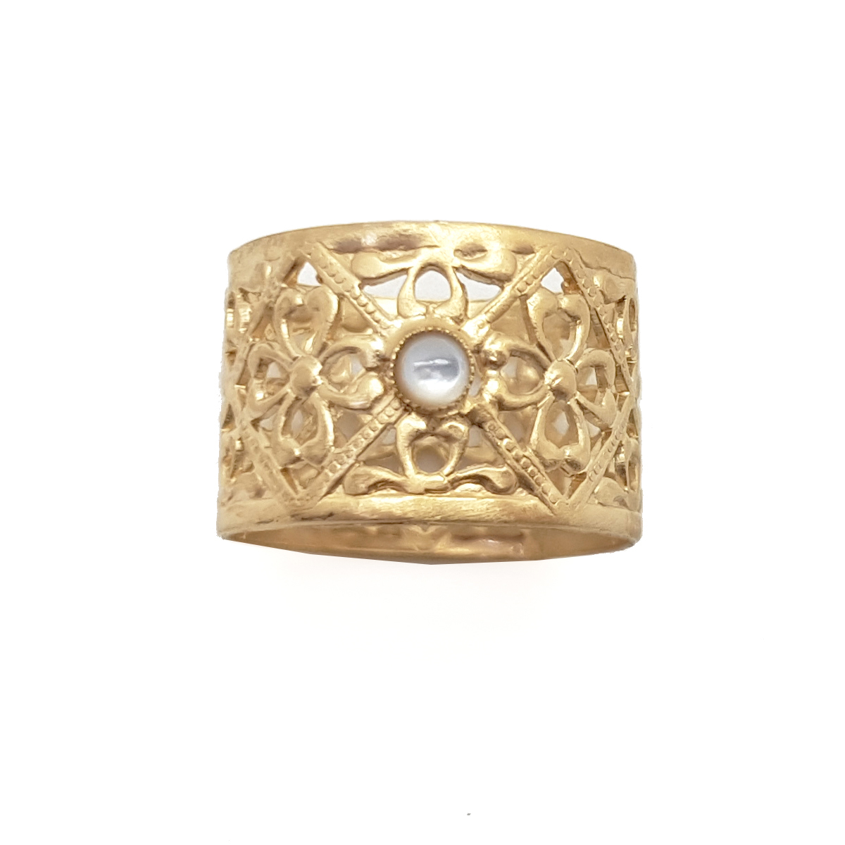 La bague JASMIN est dorée à l'or fin 24 carats, ponctuée d'une pierre de nacre naturelle.