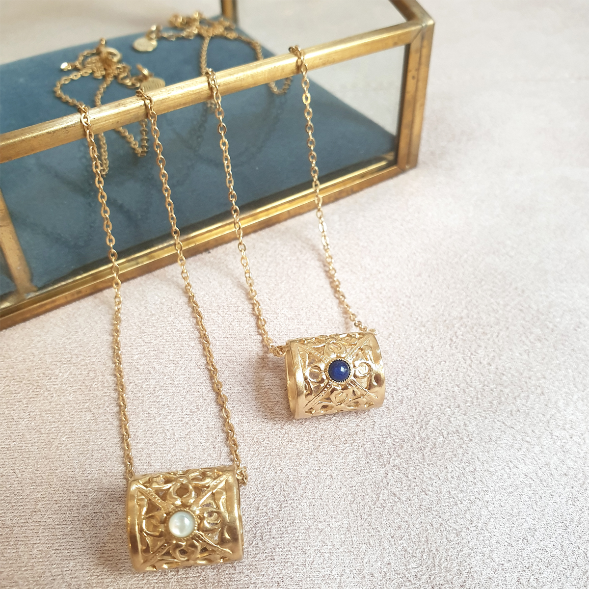 Le collier JASMIN est doré à l'or fin 24 carats, ponctué d'une pierre de malachite naturelle.