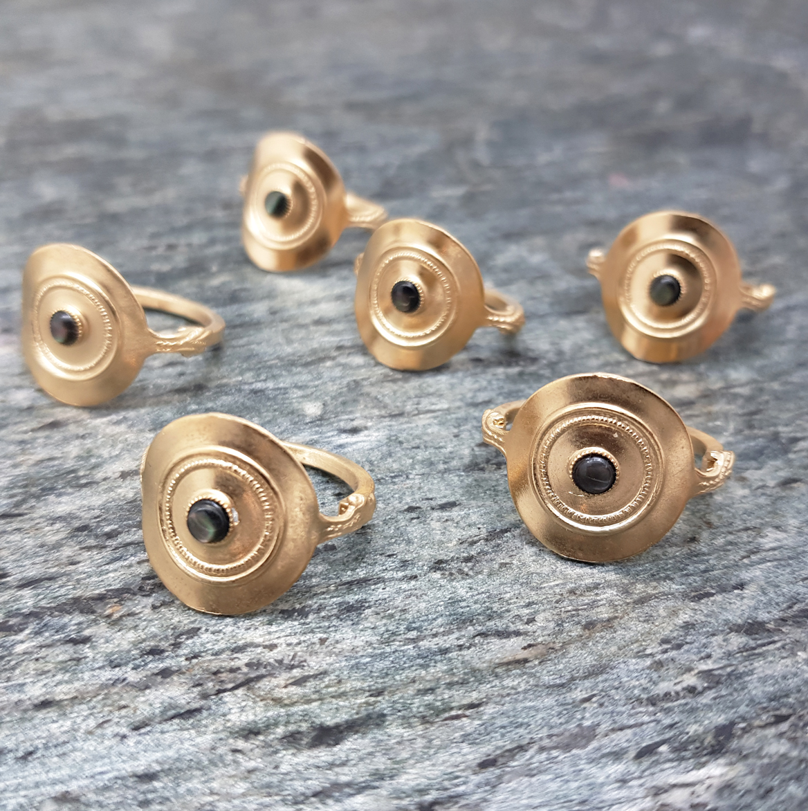 Cette bague dorée à l'or fin 24 carats, est poctuée d’une pierre de nacre grise.
