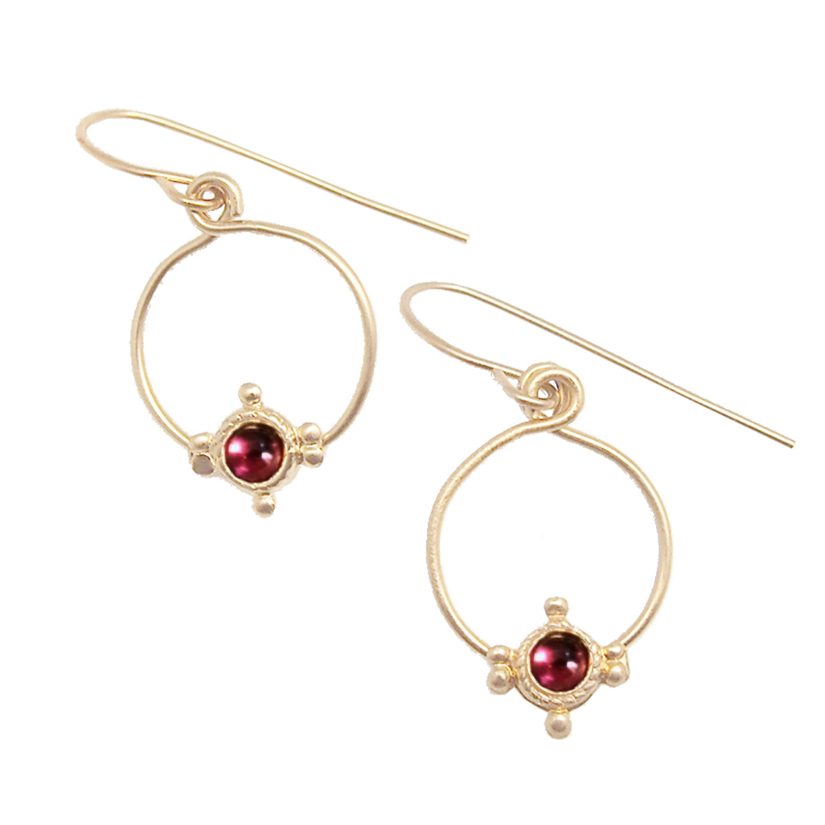 Les boucles VOLVER sont dorées à l'or fin 24 carats , ponctuées de grenat.