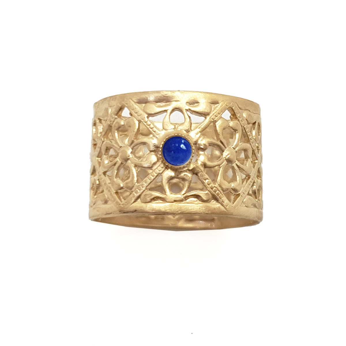 La bague JASMIN est dorée à l'or fin 24 carats, ponctuée d'une pierre de nacre naturelle.