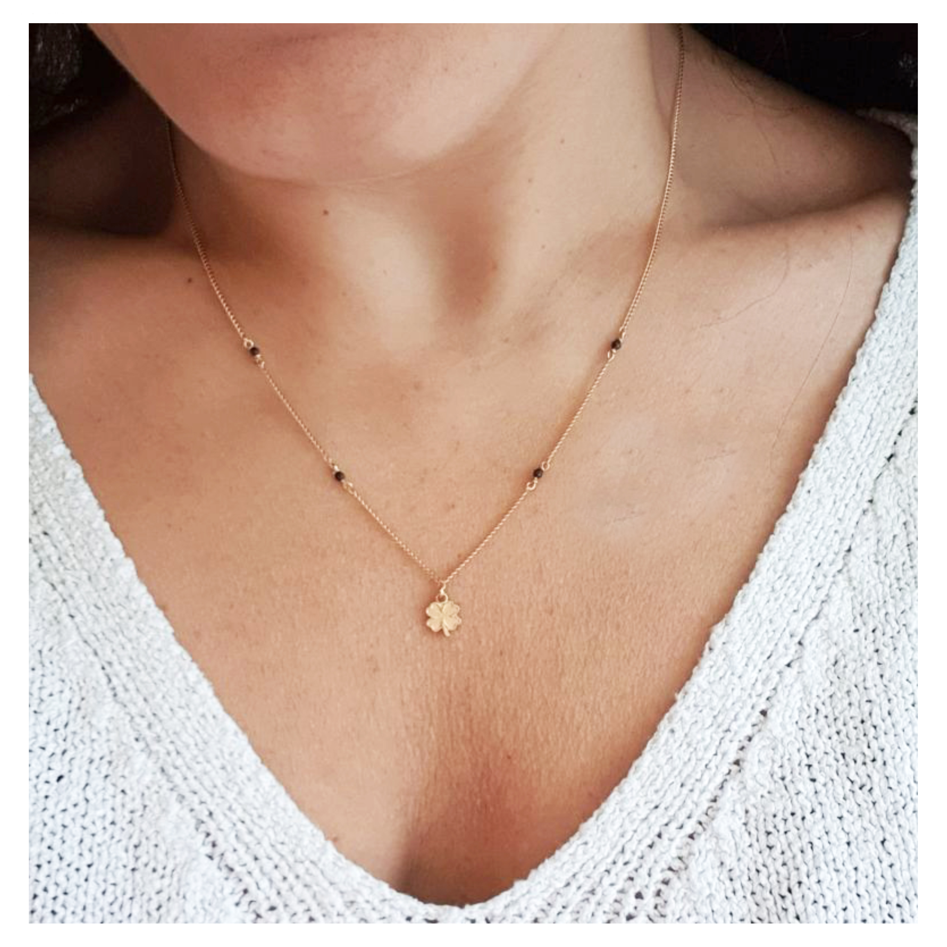 Ce collier est ponctué de pierres de saphir facettées (2x2mm), et d'un trèfle, symbole de chance (8 x 6 mm). Il est travaillé main dans notre atelier, puis doré à l'or fin 24 carats. Notre dorure est mate et de belle qualité.