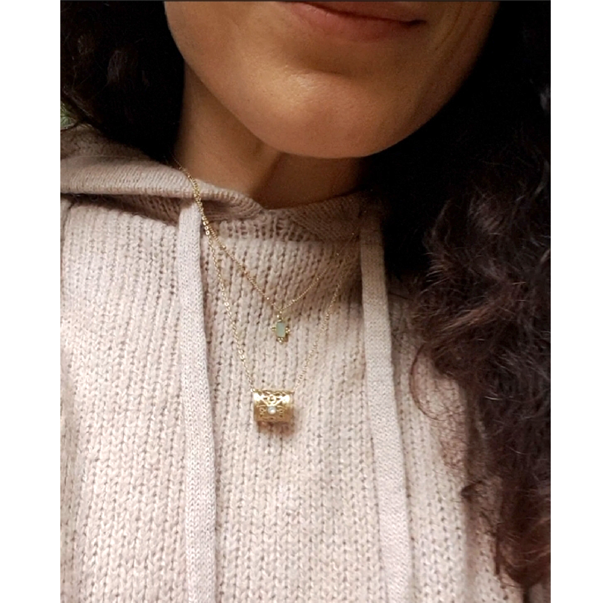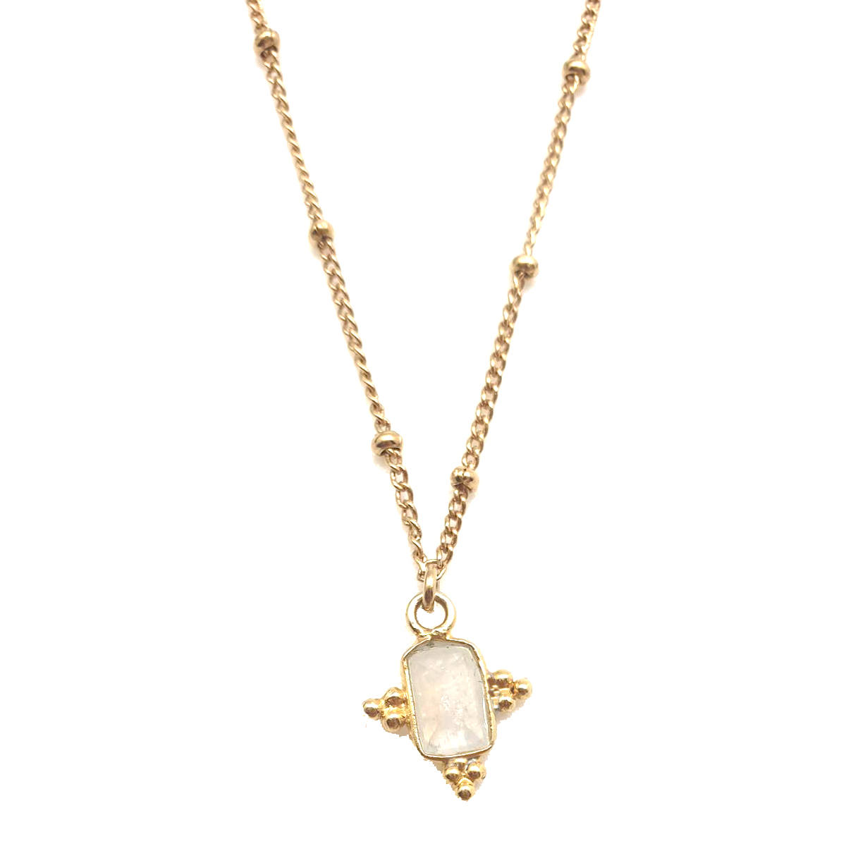 Le collier UMA est doré à l'or fin 24 carats, ponctué d'une pierre de lune.