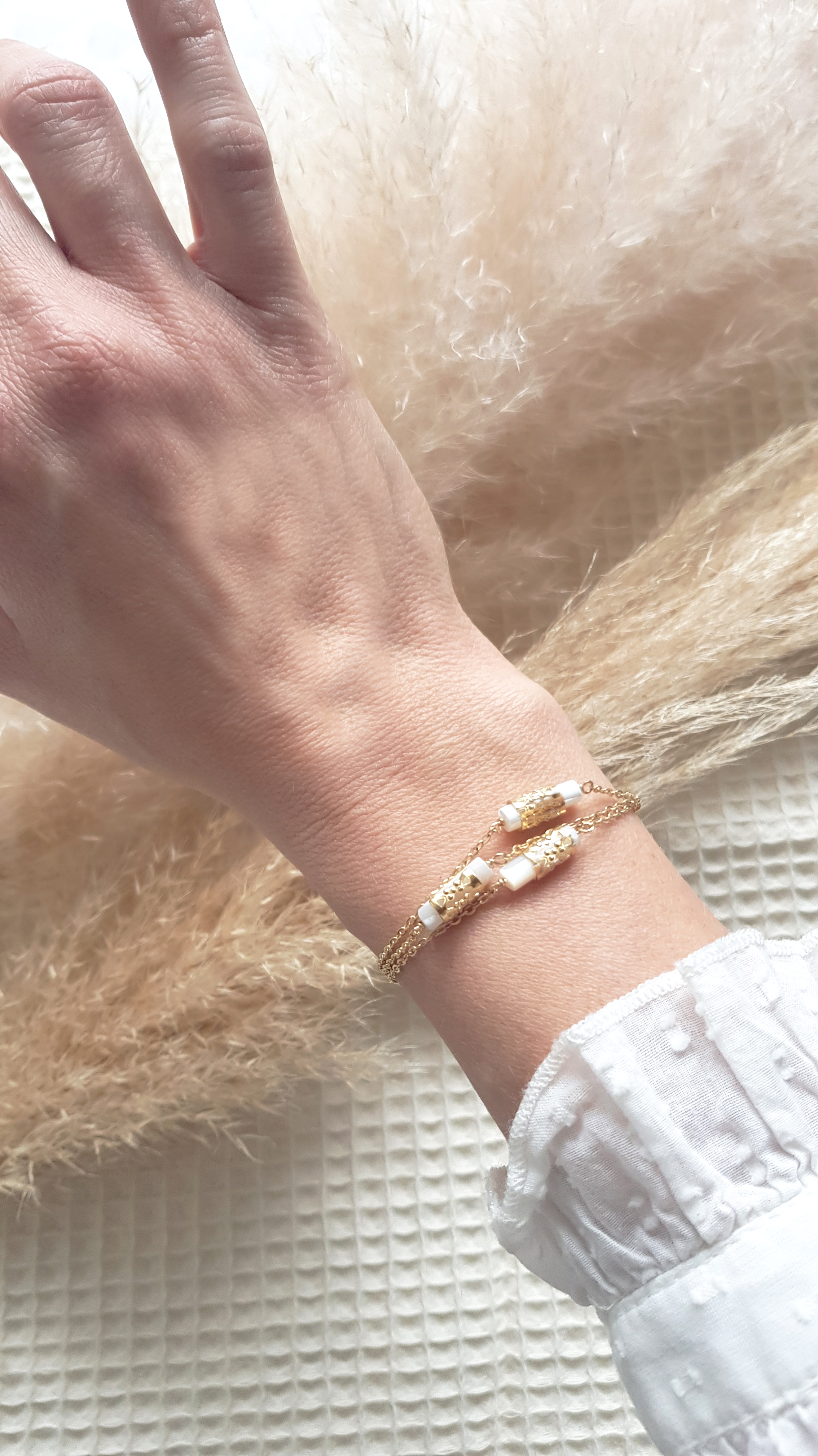 Le bracelet BALI est doré à l'or fin 24 carats, ponctué de pierres de nacre. Notre dorure est mate et de belle qualité.