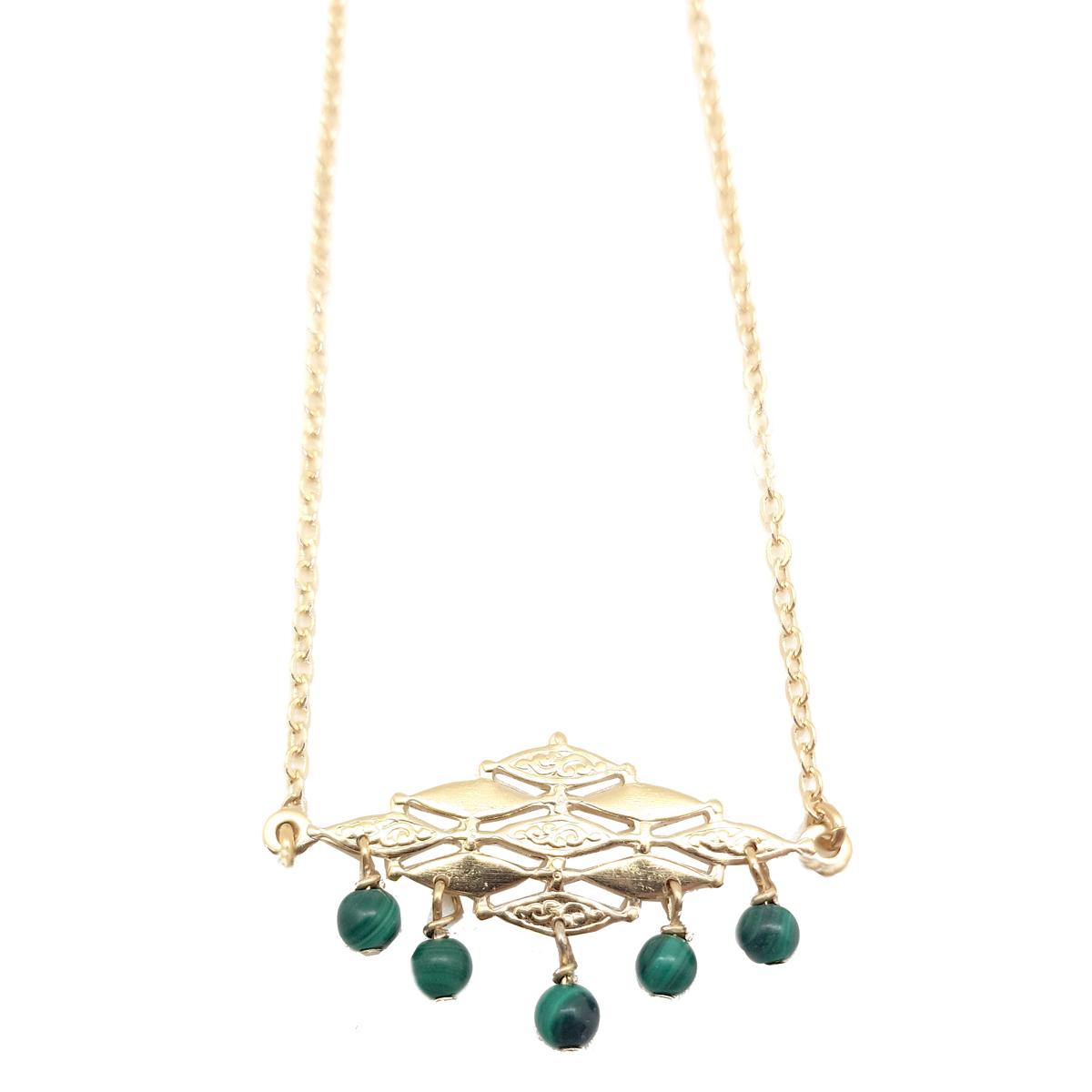 Un collier, entierement doré à l'or 24 carats, ponctué de pierres de malachite.