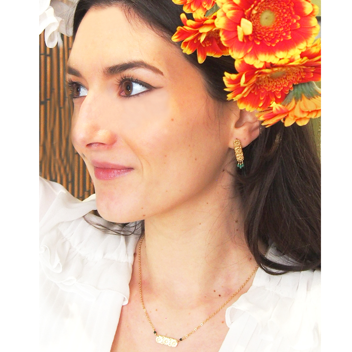 Le collier FRIDA sont dorées à l'or fin 24 carats, et ponctué de fleurs et de pierre nacre. Notre dorure est mate et de belle qualité.
